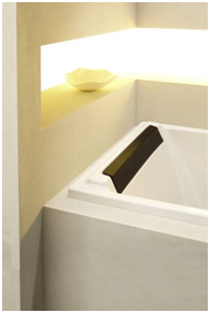 Thanks to its raised backrest and cushion, Spacio displays a geometric shape conceived for maximum well-being. The user’s back is in a relaxed position, while the neck rests on a ledge especially designed to fit a removable cushion. In short, an impeccable finish that highlights the bath’s stylish design.